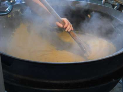 手作り給食の代表として,カレーがあります。カレーのルーは小麦粉とバター・カレー粉・脱脂粉乳を使って給食室で作りました。たくさんのスパイスを使用し,じっくり煮込んだカレーは,子どもたちに人気の献立です。