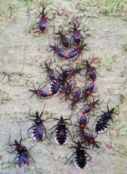 腹部の周りの模様が化粧回しに見えることからヨコヅナサシガメの和名ついたようです。もともと日本には生息してなく、インドから中国に分布していたのが帰化したもののようです。幼虫がサクラの木に群がって越冬し,春に成虫になるようです。脱皮した直後は真っ赤な体色をしているようです。肉食性のカメムシで、昆虫の体液を吸うようです。