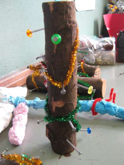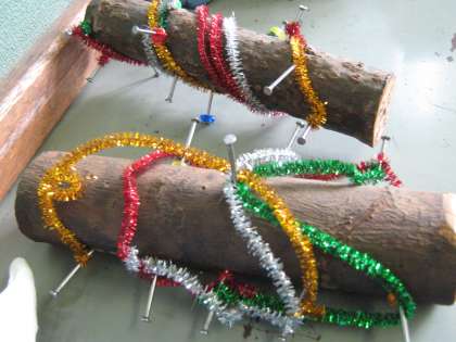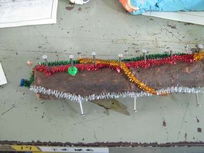 図工時間に,金づちを使ってくぎを打ちました。初めて金づちを使ったので,ドキドキしながら慎重にくぎを打っていました。最後にモールで飾り付けをして素敵な作品の完成です。l