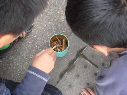 それぞれの学級で,ろうそくや木片を燃やしてみて,ものの燃え方や炎について観察しました。今までに,火を使ってものを燃やした経験はいろいろありますが,『燃える』ということについてじっくり考えた経験はほとんどありません。これからの学習で,少しずつ疑問が解決していくといいですね。