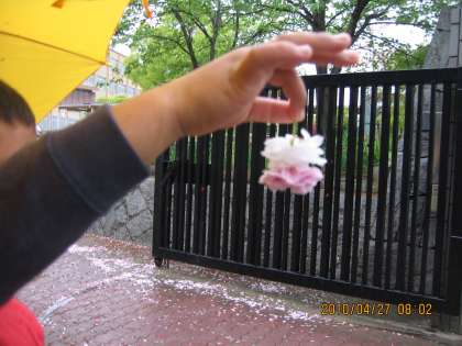 学校の門をはいった所に八重桜があります。それを見つめていた3年生の児童が,「白と赤がある。」と,持ってきてくれました。今まで毎日見ていたのに,まったく気づきませんでした。お見事3年生!