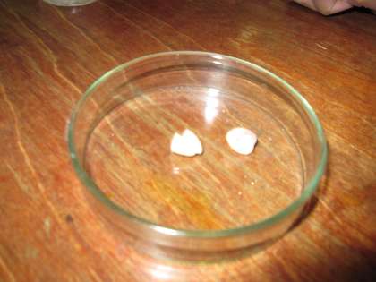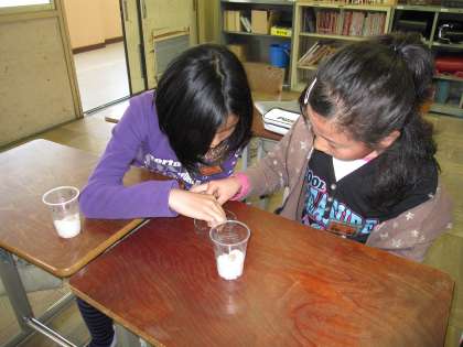 今日の実験では,切ったマメにヨウ素液をかけて,栄養があるか実験しました。見事に青色にそまり,でんぷんがあることがわかりました。