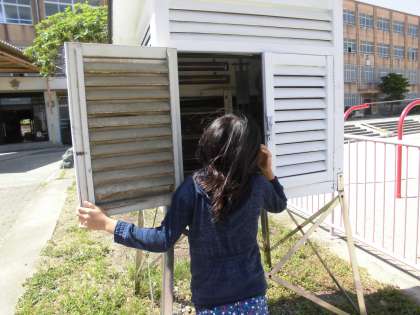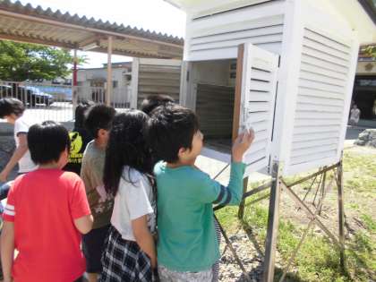 理科の学習で,「天気と気温」について学習します。天気と,1日の気温の変化について調べます。「この中初めて見た〜。」と嬉しそうに百葉箱を覗いて気温を調べていました。