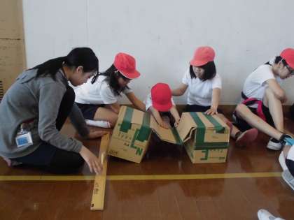 ソフトボール投げ,立ち幅跳び,長座体前屈などの種目で測定を行いました。