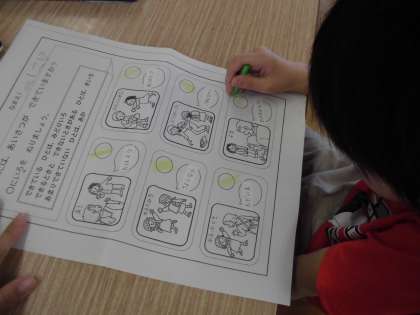 できているあいさつはみどり,ときどきできているは黄色,あまりできていないは赤で塗っていくと,「あっ,これはあんまりしていないな…」と自覚することができました。
