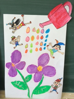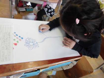 図工の「お花をさかせましょう」が完成しました!花は,植物園で見つけたお気に入りのものを描きました。また,花の上に妖精をおいて完成しました。子どもたちの思いがいっぱい詰まった作品ができました。