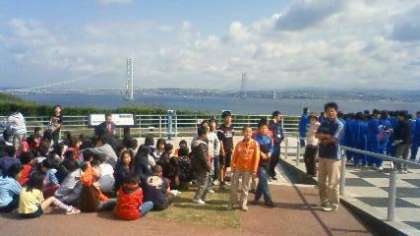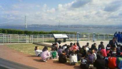 6年修学旅行団、明石海峡大橋渡り、サービスエリアで休憩。