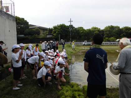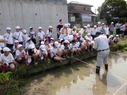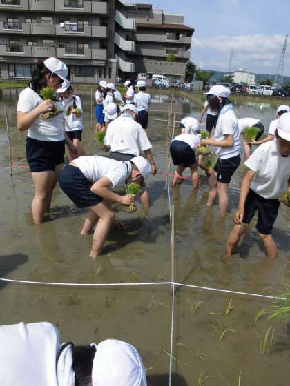 事前学習で学んでいた通り,田植えまでに苗を育てたり,田の準備をしていたこと教えてもらった同時に,苗と苗の間をあけることの大切さも教わりました。