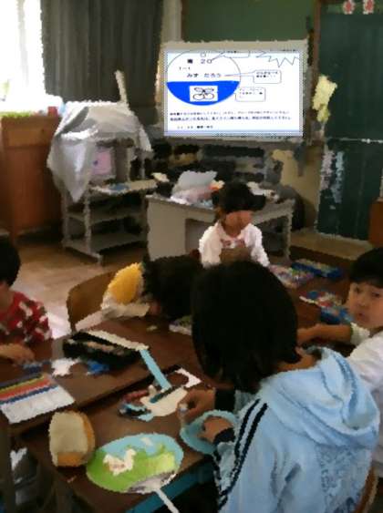 大型画面に名簿や名札作りの方法を映し出すと,大型画面を見慣れていない子は,びっくり!!画面に釘付け!