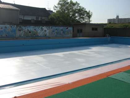 おはようございます!! プールでは改修工事が進んでいます。きれいに洗われた面に下塗りが施されています。まぶしいほどの白です。土曜日には,側面の塗装が終わりました。完成は,全面ブルーになるようです。今年のプールが楽しみです。