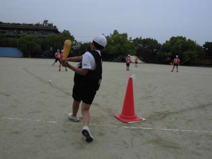 一般の野球とは違い,三角コーンの上に切ったペットボールを重ね,その上に玉入れのボールを置きます。前回までは,そうして固定されたボールを打つ練習や,守備の練習を行ってきました。