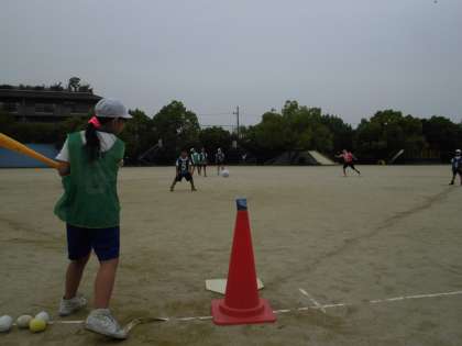 そして,今日はいよいよ試合にチャレンジです!ルールや守備の場所を確認した後,試合を開始しました。ピッチャーが投げるボールを打つわけではないので,野球を経験したことのない子も,ボールを遠くまで飛ばすことが出来ていました!打順をまつ子から待つ子からは,アドバイスが飛び交う様子も見られました!