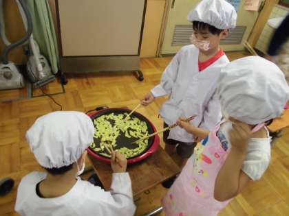 3時間目に下ごしらえをし,5時間目に調理して食べました。