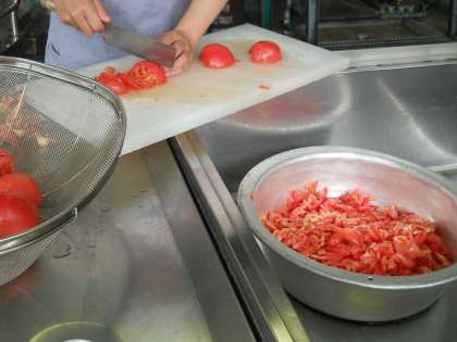 旬の野菜の「ピーマン」と「トマト」使いました。子どもたちが季節のおいしさを味わえるようにしています。
