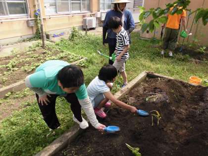 じゃがいもの収穫をしたあとの畑を耕して,さつまいもの苗を植えました。
