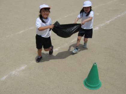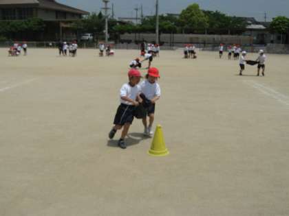 今日は先週やったボール運び競争を運動場でしました。