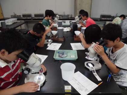 科学センターに到着すると,学級ごとにわかれて観察・実験学習を行いました。1組は,音の仕組みについての実験を行い,水笛を作って音の高さを調節するなどの体験をしていました。2組は,様々な場所の砂で自分だけの標本作りを行い,その砂を双眼実体顕微鏡で観察したり,試験管グラフを作って観察したりしました。