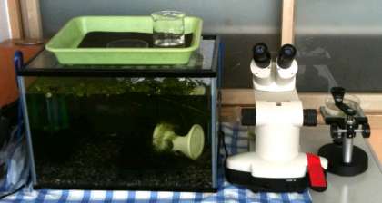 メダカのたまごの観察がいつでもできるように,解剖顕微鏡と双眼実体顕微鏡を設置しました。
