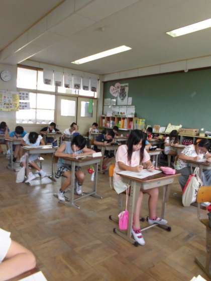 ジョイントプログラムの様子です。静まり返った教室に子どもたちの鉛筆の音が響きます。悩んだ問題は飛ばして次の問題に進んだり,一通りやり終えた後は,もう一度見直したりしながら,それぞれが精一杯テストに取り組んでいました。
