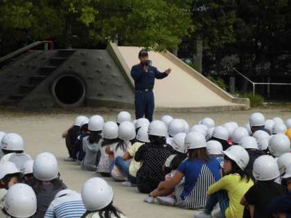 「避難態度がとてもよいですね。」と褒めていただきました。運動場での事後のお話もしっかりと聞けていました。今後も,このような訓練を生かして,安全に対する意識を高めていきます。
