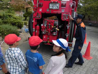 終了後には消防自動車の仕組みを丁寧に教えてくださいました。消防の仕事を学習している4年生が熱心に質問をしていました。