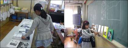 黒板や給食台に関係する本や資料を並べて,アイデアスケッチの参考にしています。