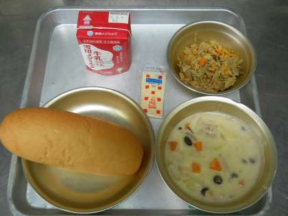10月20日の献立は,「コッペパン・牛乳・ツナごぼうサンド(具)・きのこのクリームシチュー」でした。