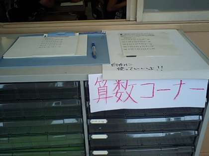 本校では研究教科を算数としています。児童の興味関心を高め,児童の系統立てた思考を導き出そうと日々がんばっています。そんな取組の一環として6年生の教室前の廊下に「算数コーナー」を作りました。今は「メイク10」4つの数字を+・−・×・÷を使って10にします。今後タングラムや算数パズルを置く予定です。