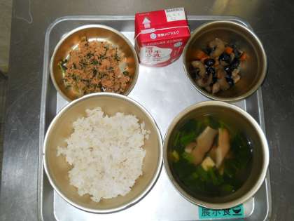 10月22日の献立は,「麦ごはん・牛乳・さけとだいこん葉のまぜごはん(具)・黒豆の五目煮・とうふの吉野汁」でした。