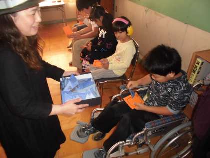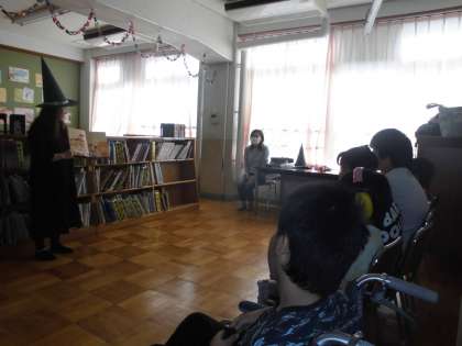 図書室へ行くと,いつもと違う雰囲気の中,ハロウィンの絵本を読んでもらいました。