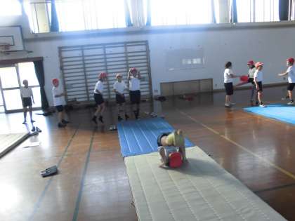 今,体育ではマット運動に取り組んでいます。前転から,開脚前転などの開脚技,側方倒立回転などの回転技など,一人一人自分のめあてに向かって取り組んでいます。
