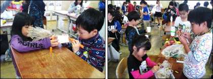 1年生が生活科でドングリやはっぱなどを使っておもちゃや飾りを作っています。