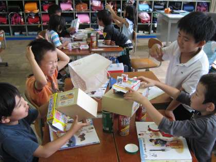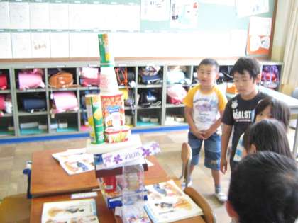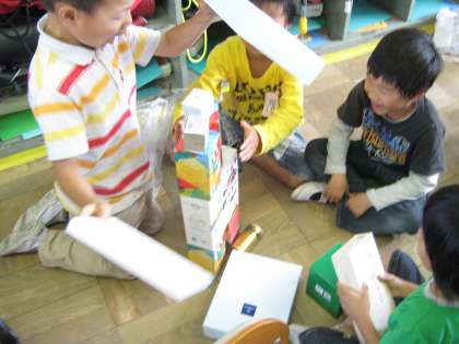 今日の算数は,ご家庭から持ちよった箱や空き缶を使ってかたちの勉強をしました。色々な形を組み合わせて大きなお城を作ったり,高いロケットを作ったり,子どもたちは工夫して楽しんでいました。