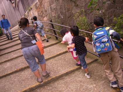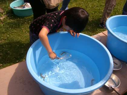 バスに乗って,気分は上々♪大きなバスの窓からは,大好きな電車やスーパーが見えました。他の学校のお友だちもどんどん乗ってきて,レッツゴー!科学センターで最初に見つけたのは,「魚すくい」「ザリガニつり」!