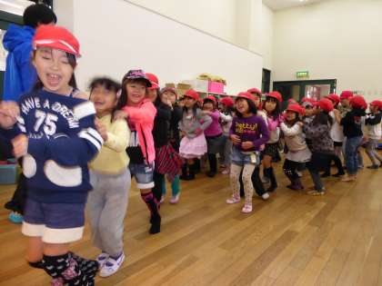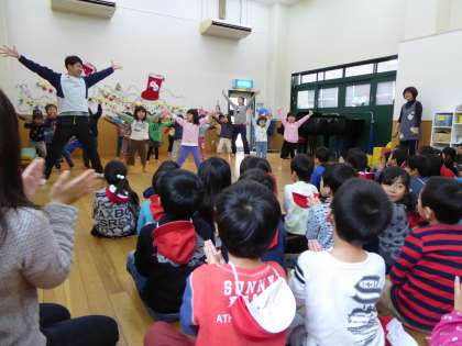 保育園児さんたちの歌やダンスを鑑賞した後には,年長組の子ども達と一緒に楽しく遊びました。