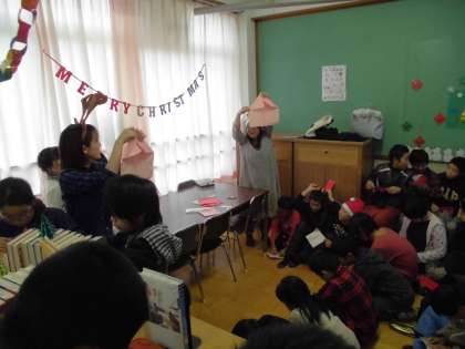 今回はサンタの折り紙をみんなで作り,おもいおもい顔を描き持ち帰りました。サンタの帽子の金色の飾りがおしゃれでした。読み聞かせでは「大きなサンタと小さなサンタ」の読み聞かせを読んでいただきました。図書室もクリスマスの飾りで彩られ,楽しい雰囲気の中でのイベントでした。