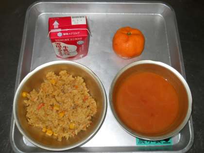 1月13日の献立は,「カレーピラフ・牛乳・トマトスープ・みかん」でした。