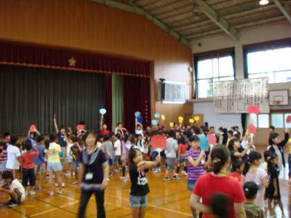 今年度初の児童集会。児童集会はたて割りグループごとに整列します。6年生は自分の色のグループ番号の入ったうちわを持ち,グループのメンバーを集めます。去年の6年生がしていたので大丈夫・・・だけどグループのメンバーが自分を見つけてくれるのか,ちょっと心配でした。無事集まり,後半では集会委員会主催のみんな遊びをして楽しみました。