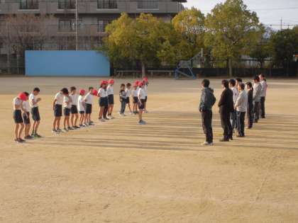 お天気で今日になった陸上のお別れ試合では,リレーをして先生チームと対戦しました。
