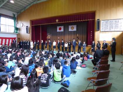 児童の前に教職員全員がずらりと並び挨拶をしました。子ども達は「担任の先生はだれかな・・・。」と,どきどきしながら発表を待っていました。