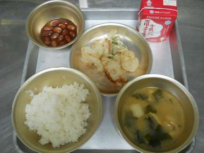 4月15日の献立は,「ごはん・牛乳・かきあげ・金時豆の甘煮・みそ汁」でした。