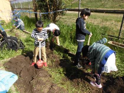 今年度もつばさ学級は裏庭の畑の区画を3つも使わせてもらえることになりました。