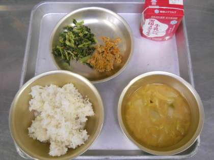 4月18日の献立は,「麦ごはん・牛乳・ツナそぼろ丼(具)・だいこん葉のごまいため・春野菜のみそ汁」でした。