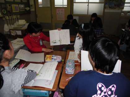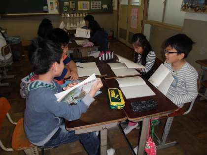 「春のうた」の詩を音読しました。情景を想像し,音読の仕方を工夫することがねらいでした。間の取り方,速さ,強弱に変化を加え,読むことができていました。写真は,班ごとに分かれ,自分の音読を発表しているところです。