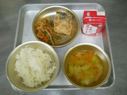 4月22日の献立は,「胚芽米ごはん・牛乳・さばのたつたあげ・野菜のきんぴら・キャベツの吉野汁」でした。