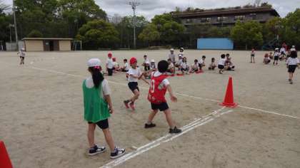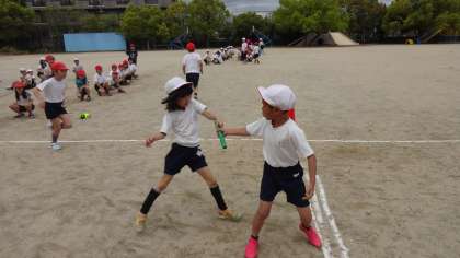 リレーの学習は初めてでしたが,今日はバトンパスの方法について学習し,バトンを落とすことなく上手にバトンをつないでいました。