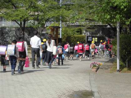 町ごとに分かれて集合時刻の確認や安全に登校するための約束などを話し合う集会をしました。その後登校班での並び方を確認し,きちんと並んで集団下校をしました。いずれも地域委員さんに立ち会っていただきました。地域・保護者・学校が協働して子どもたちの安全を守り,はぐくんでいます。