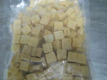 “小松菜とゆばの煮びたし”は,今月の新献立です。「ゆば」は大豆の加工食品の1つです。豆乳を加熱した時にできる膜で,大豆の植物性たんぱく質のかたまったものです。日本には比叡山の延暦寺に最初伝わり,精進料理の材料とされていました。今回は「ゆば」と小松菜を煮びたしにしました。