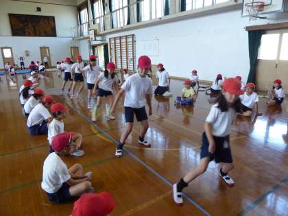 美豆小学校では,高学年が,低学年や中学年の体力測定をサポートしながら実施しています。