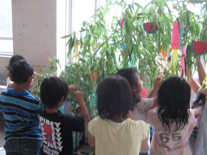 読み聞かせのあとは明日が七夕ということで,短冊にお願い事を書いて,